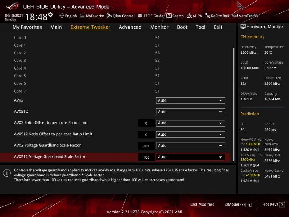 ASUS is giving three options for multi-core overclocking aside from setting the ratio: BIOS optimized, Enabled (ignores the default limits), and Disabled (follows the thermal and TDP limits). AVX-512 offset and settings are easily managed through the BIOS.