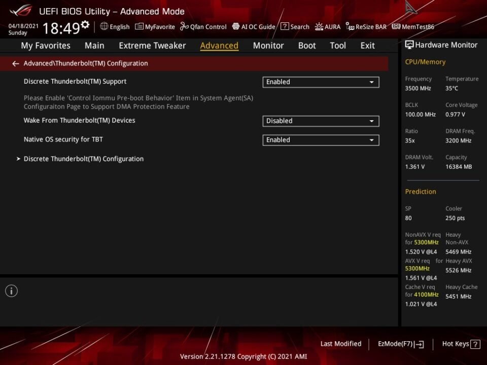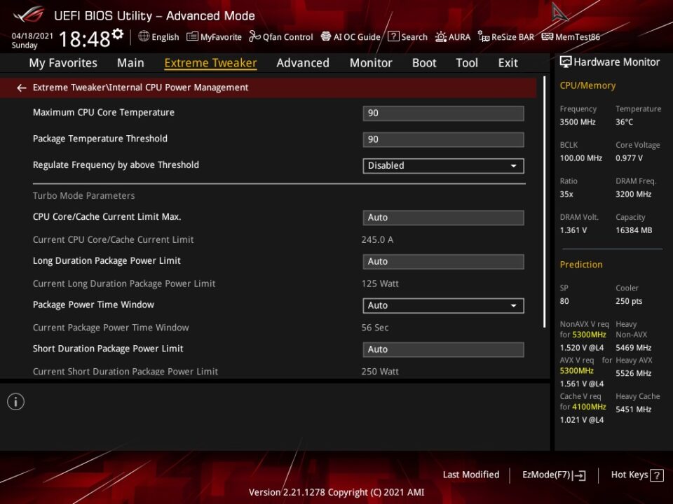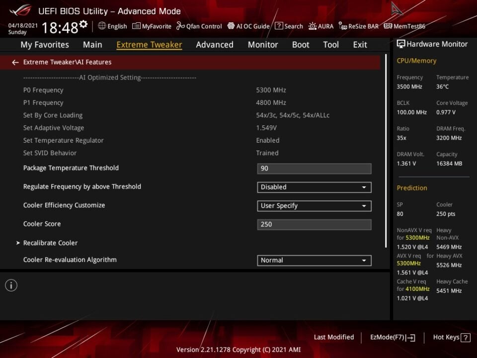 We tested the board using two modes: default settings and Adaptive mode. Based on our testing, however, the ROG Maximus XIII Extreme is rather lenient when setting up its own thermal limits. The CPU will regularly throttle regulate its temperature at around 75°c, thus lowering frequency. It seems that the BIOS, at least in our opinion, is still sticking to the default specifications of the CPU prior to the introduction of Adaptive Boost.