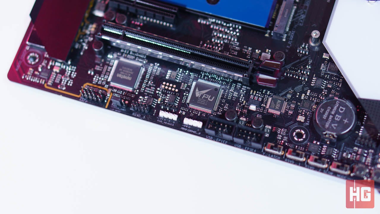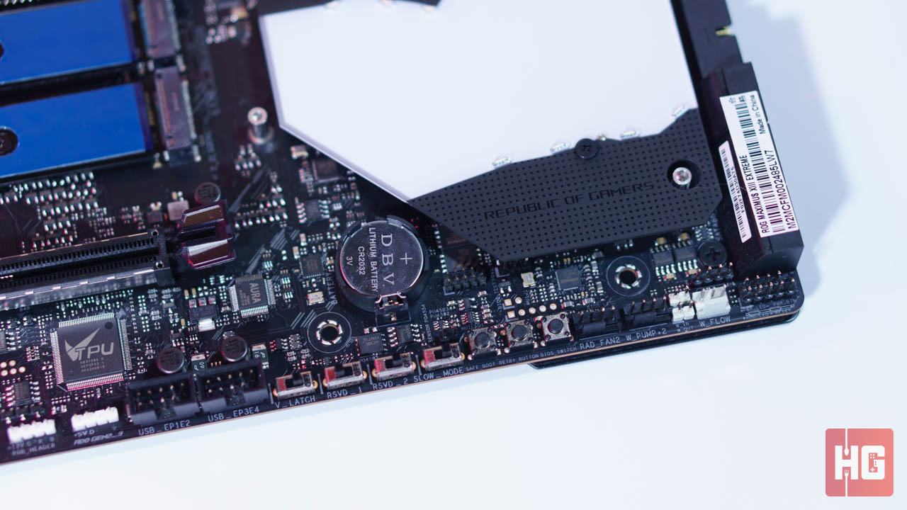 The top right-most side houses its Q-LED Reader for debugging and its Power and Flex Key buttons. The Flex Key, by default, is mapped to reset but can be changed to any BIOS-related button you want like via the BIOS. You also get here status lights for the Water Pump and Radiator Fan and two 5V 3-pin RGB headers.