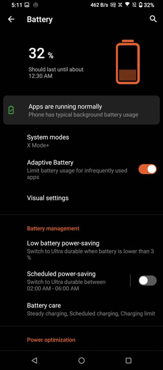 In a more realistic environment, we lasted around a day and a half with medium usage with occasional gaming running on X Mode with the AeroActive Cooler 5. Further battery savings can be found by toggling the display to a slower mode like 60Hz. Fortunately, waiting in between charges is kept at a minimum thanks to its 65W charging capabilities.