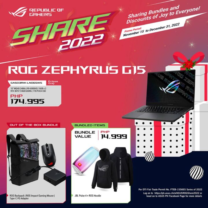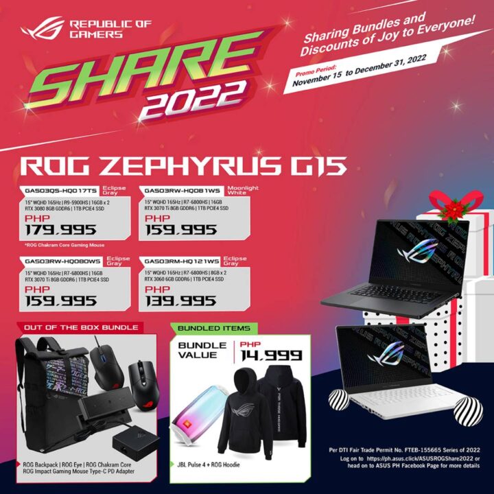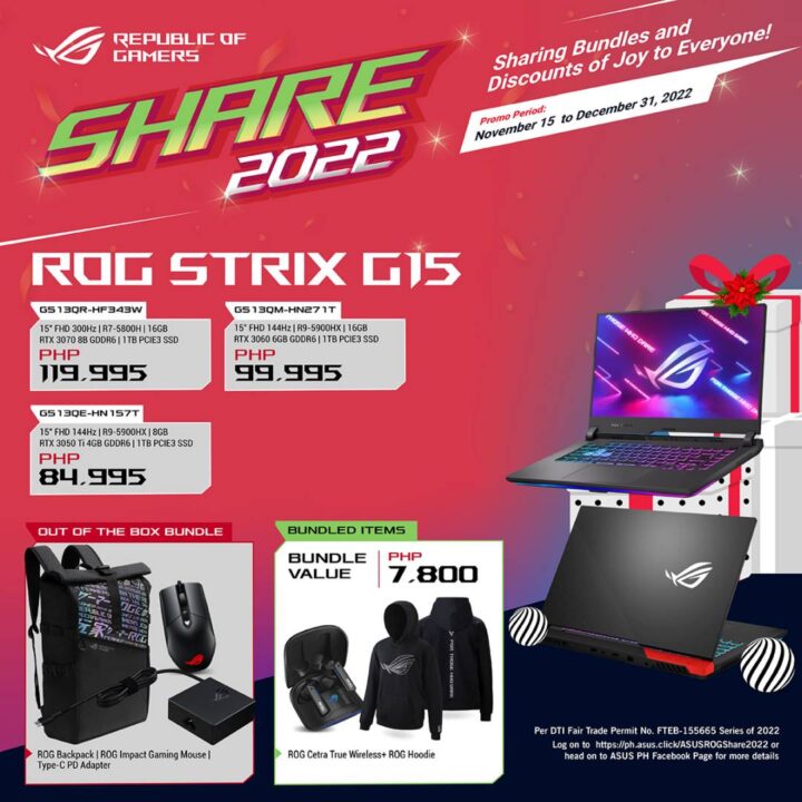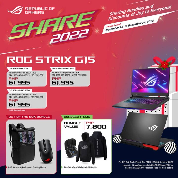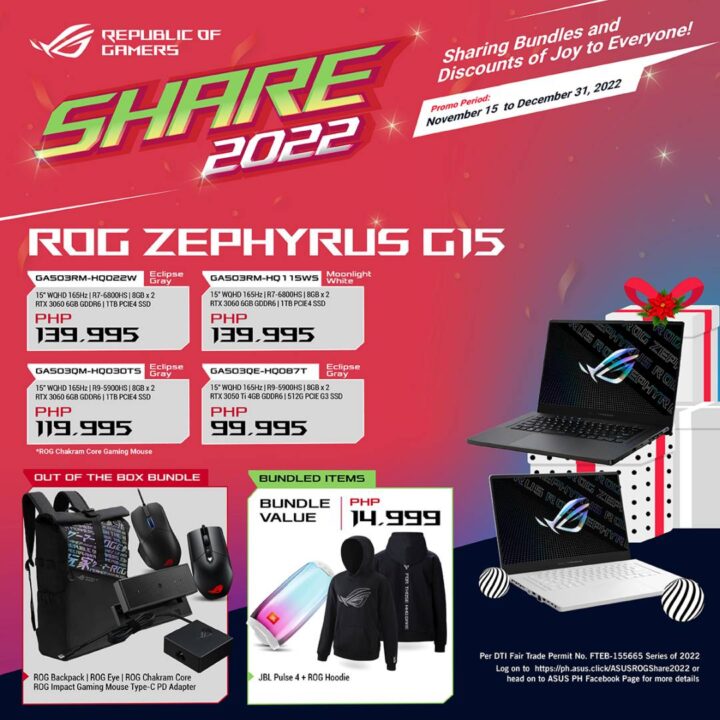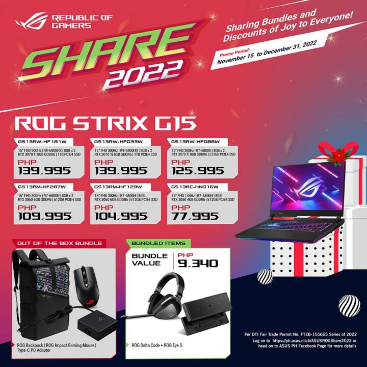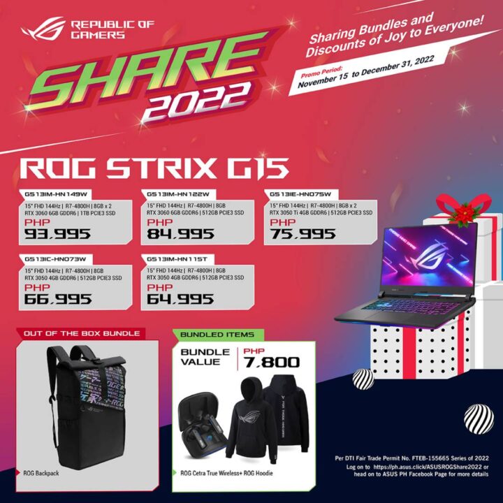 ROG Share 20222 is an official promo being run by ASUS to bundle several products whenever you buy a gaming laptop from either the TUF or ROG line. If you are planning on getting a new gaming laptop this year, best take a good look at the huge list of participating products. Bundles range from PhP 2,000 to PhP 23,060 and may include gaming headsets, high-end gaming mice and keyboards, ROG hoodies, and more.