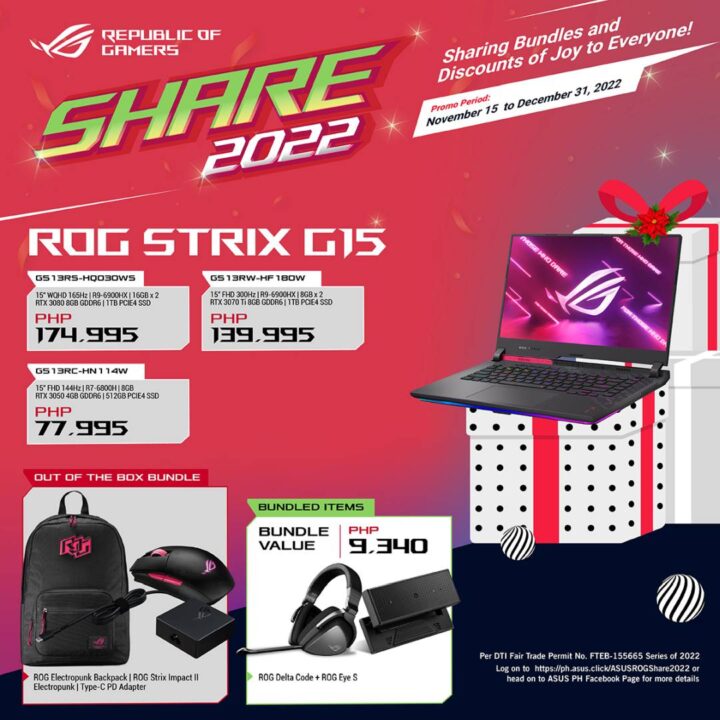 The total ROG Share Deals 2022 bundle for the ROG Strix G15 2022 is PhP 9,340. Included in the bundle is an ROG Delta S Core gaming headset and an ROG Eye S, a high-res webcam.
