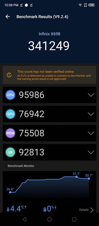 Performance of the smartphone is pretty good when it comes to synthetic benchmarks. AnTuTu is able to reach the 341,249 mark, PCMark Work 3.0 scores 9,286, and the device is able to scorer 505 and 1,619 in single-core and multi-core benchmarks in GeekBench 5.