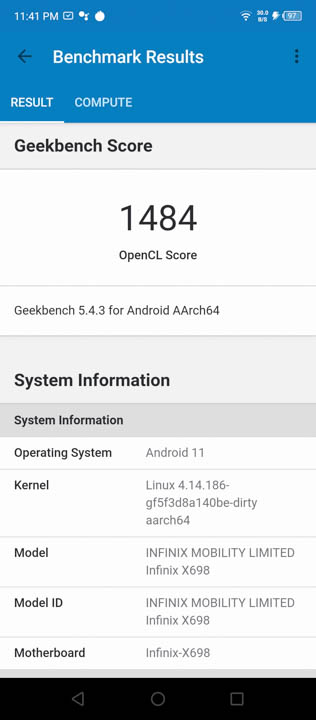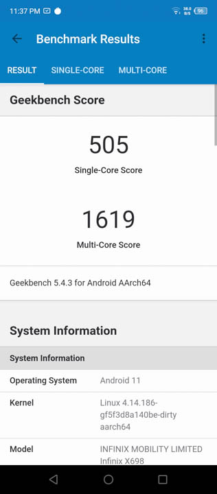 The Infinix Note 11S runs with a MediaTek Helio G96, which sports 2 Cortex-A76 cores, 6 Cortex-A55 cores, and a Mali G57 MC2 GPU. The chip is paired with 8GB of LPDDR4x RAM that allows most users to run plenty of apps without stuttering. It’s worth mentioning that the smartphone is able to cool itself efficiently and does not become hot to the touch even in heavy workloads.