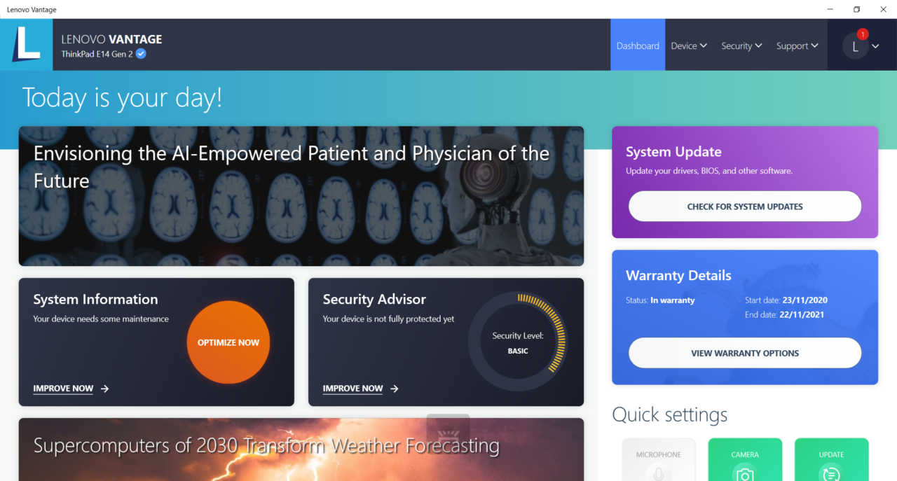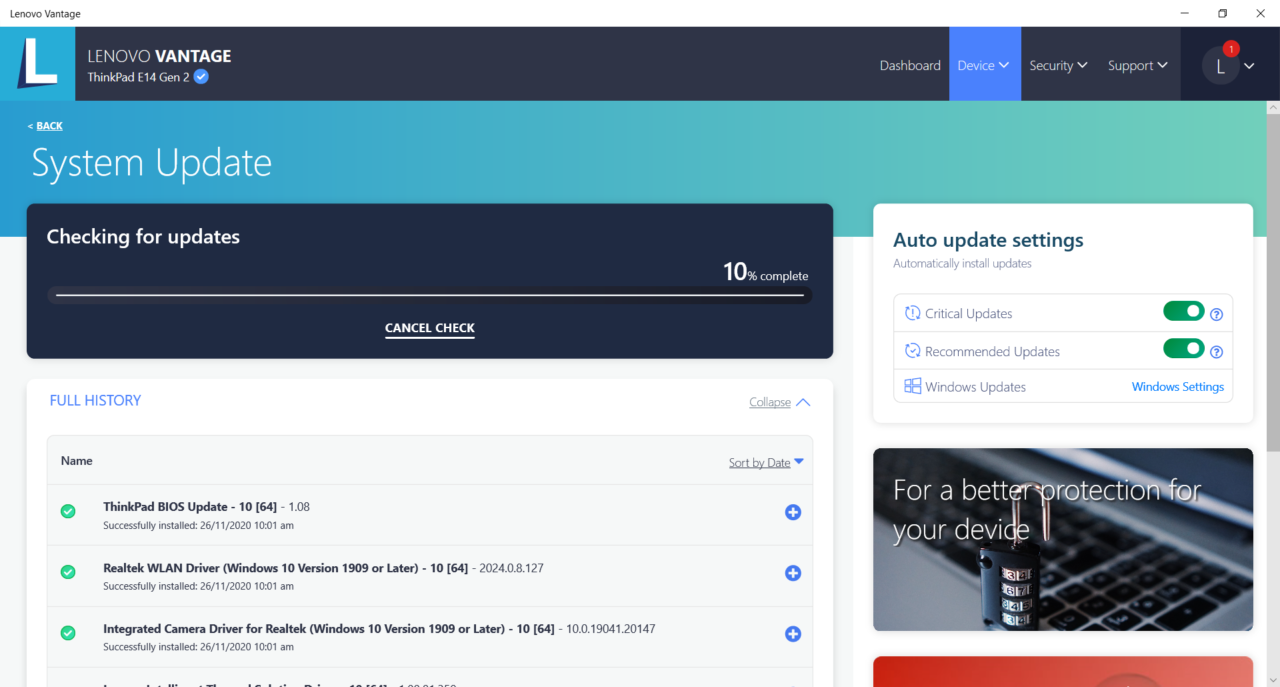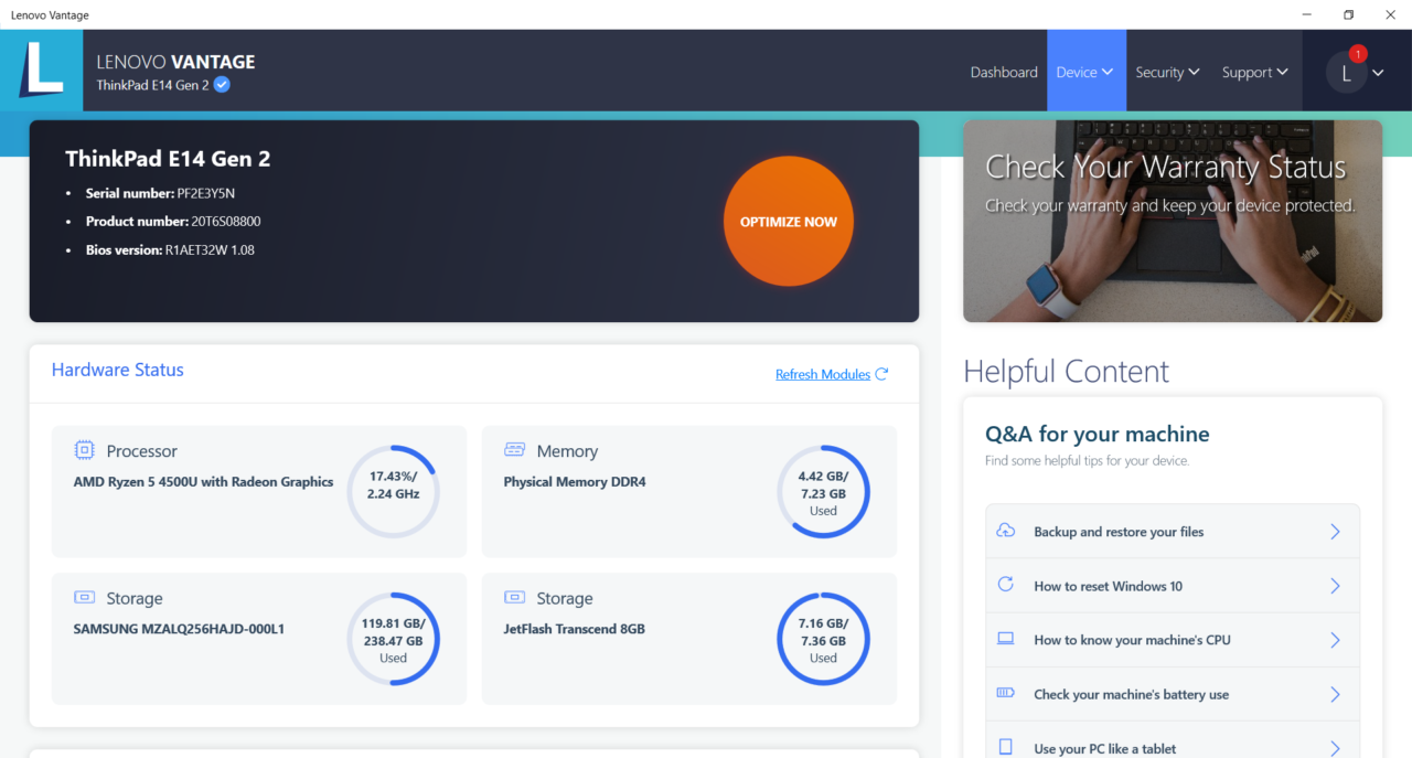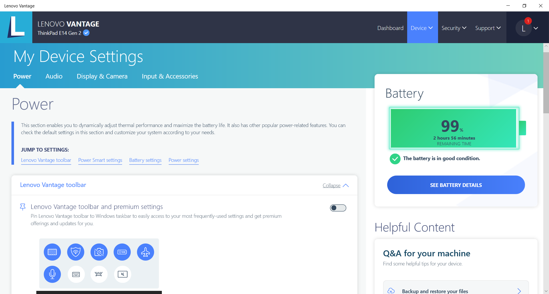 Like all their current notebooks, the ThinkPad E14 ships out with Lenovo Vantage pre-installed. The brand’s software allows you to seamlessly monitor hardware, install crucial updates, and see current battery levels.