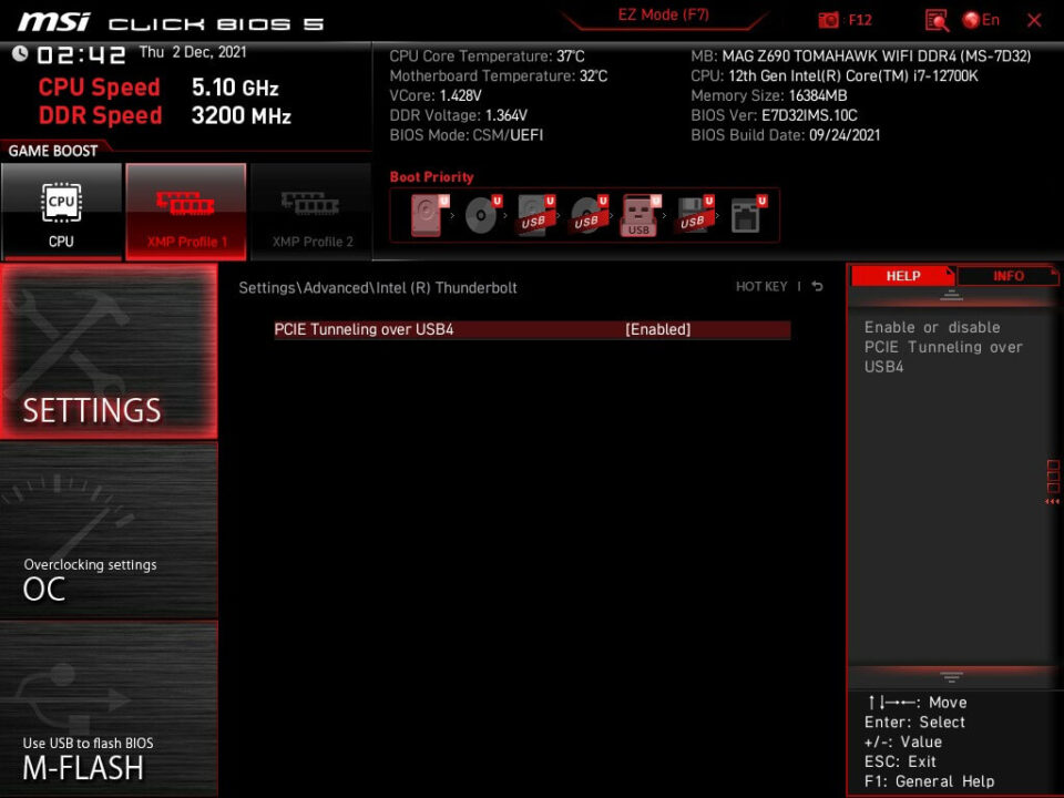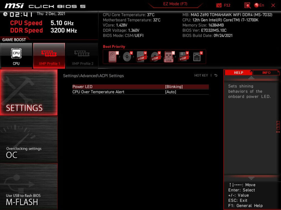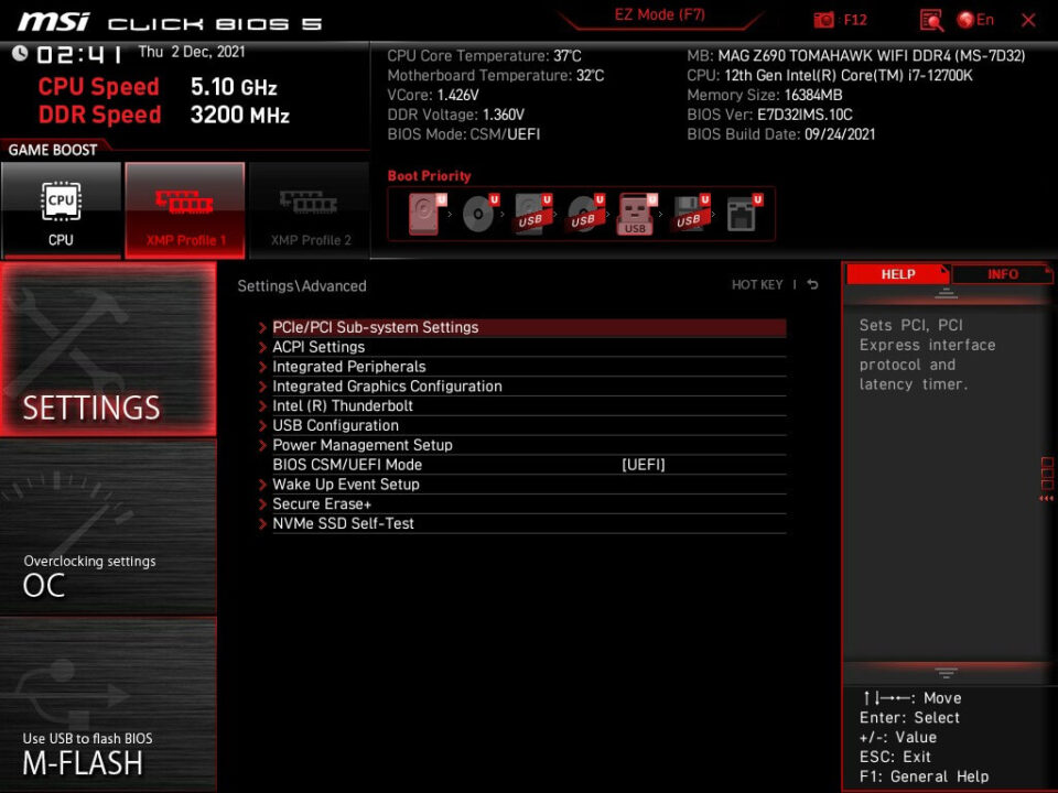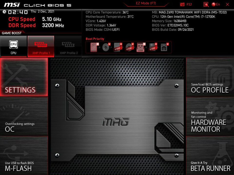 Basic and advanced UEFI options are covered by the MSI MAG Z690 Tomahawk WiFi DDR4. It can be accessed by pressing DEL or F2 on boot and starts automatically in EZ Mode. Its default page shows everything important such as clock speed, XMP profiles, temperatures, CPU voltage, CPU and motherboard models, and BIOS version.
