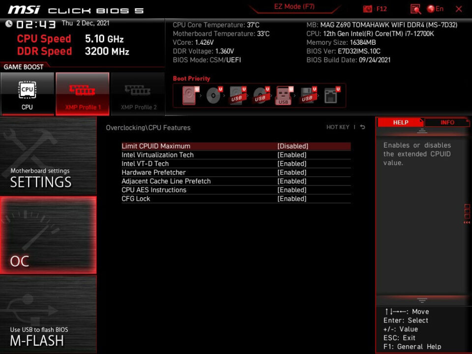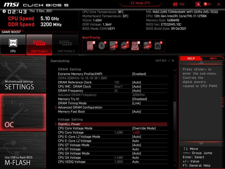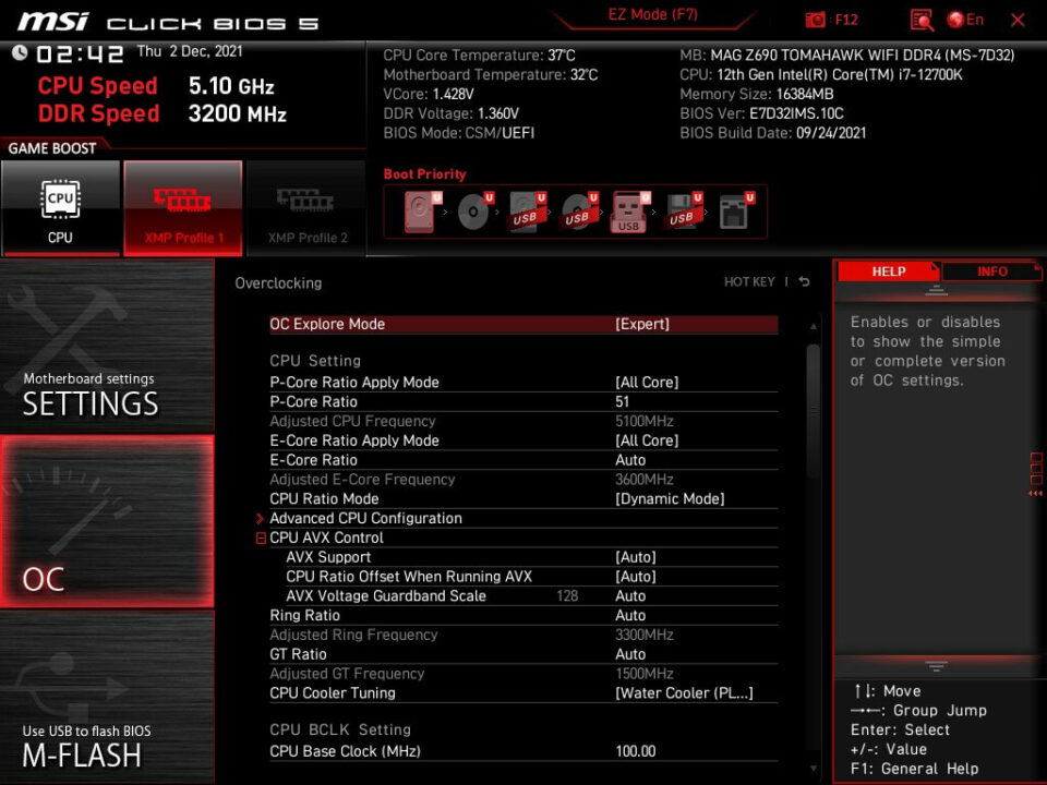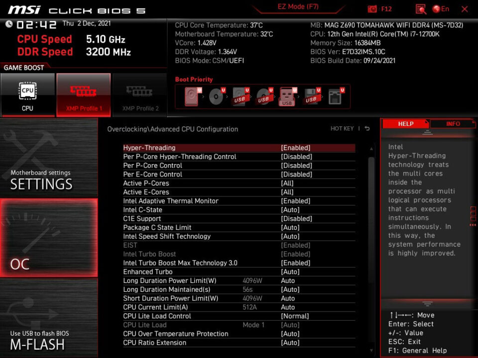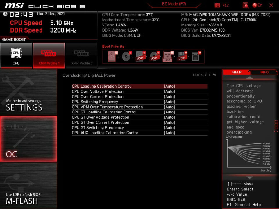 Alder Lake and the Z690 platform brings in new options such as separate clock speed options for P- and E-Cores. C-States, Speed Shift, and Turbo Boost 3.0, and load line calibration can be easily adjusted via the OC settings page.