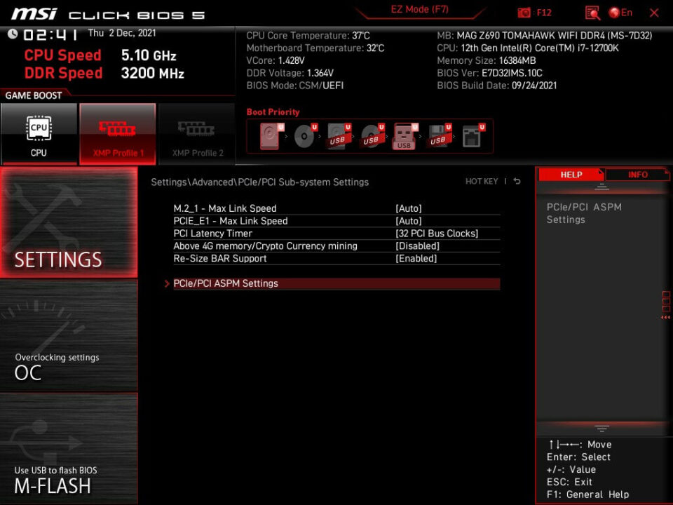 Advanced options include fan curves for cooling, subsystem settings, USB configuration, Re-Size BAR support, and PCIe latency timers among many others. Overclocking options are easily accessed via the OC page and comes with all the settings you would need to improve CPU and RAM performance.