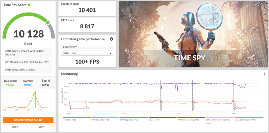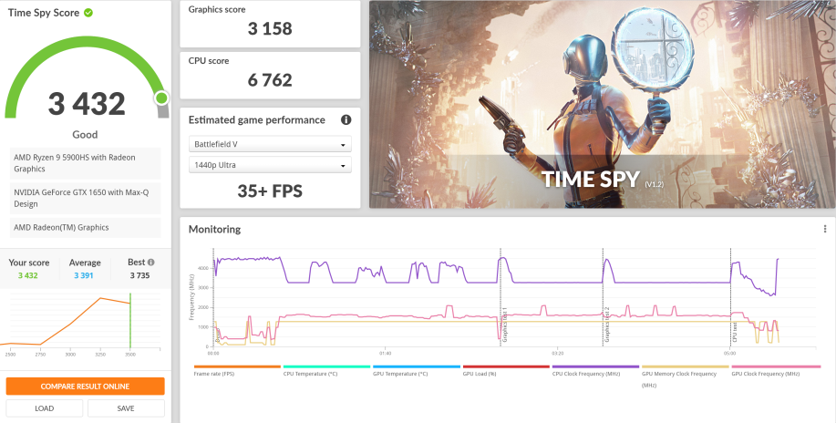 The overall score was greatly affected by the CPU Mark. Take a look at the 3D graphics mark to see the large jump between the GTX 1650 and the RTX 3080.