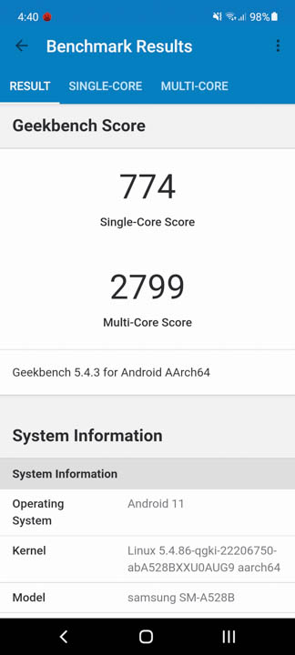 Scores on synthetic benchmarks are pretty decent with the device reaching the 500,000 mark in AnTuTu Benchmark, 2,497 in 3Dmark Wild Life, 2,799 in GeekBench 5 Multi-Core test, and 12,085 in PCMark Work 3.0.