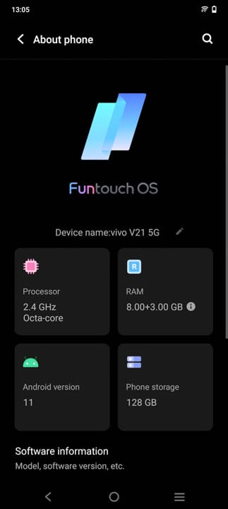 Powering the vivo V21 5G is a Dimensity 800U chipset courtesy of MediaTek. The chip also allows the device to have 5G support. It is complemented by 8GB RAM and 128GB UFS 2.2 storage. If 8GB isn’t enough, however, vivo is also allowing for 3GB extended RAM that will be taken from its internal storage. It is magnitudes slower than its dedicated RAM but it’s there if the system needs it.