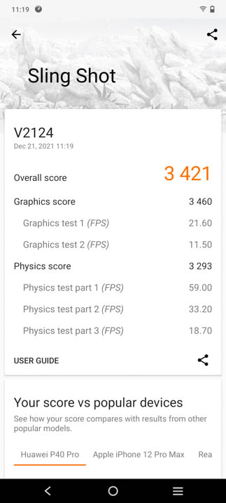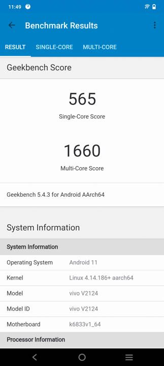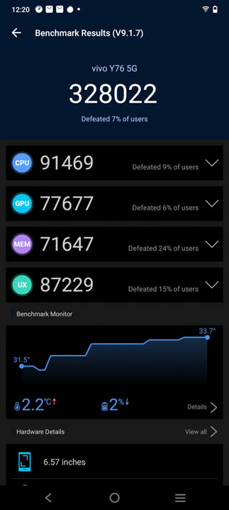 Synthetic benchmark figures are pretty average. The Y76 5G scores 328,022 in AnTuTU, 1,660 multi-core in GeekBench, 6,506 in PCMark Work 3.0, and 1,101 in 3DMark Wild Life.